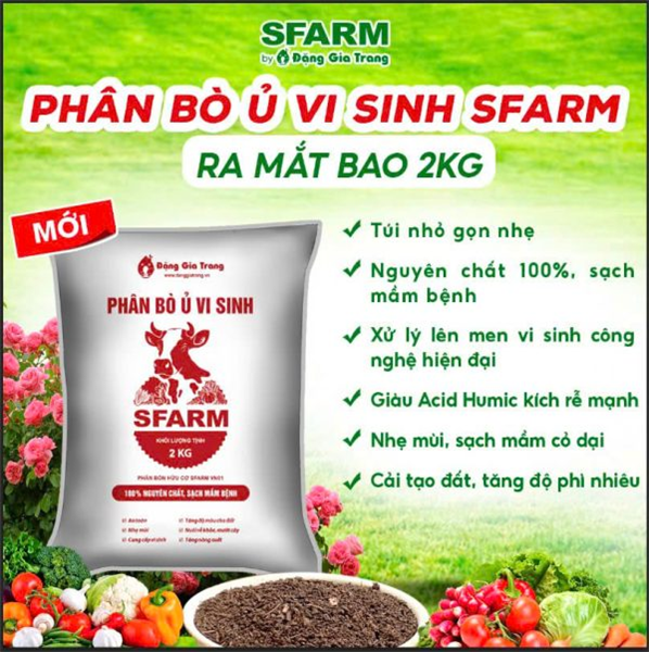 Phân bò ủ vi sinh SFARM sản xuất từ 100% phân bò, được xử lý với công nghệ ủ vi sinh hiện đại giúp loại bỏ hoàn toàn mầm bệnh gây hại, cung cấp nguồn dinh dưỡng đa, trung, vi lượng và Acid Humic dồi dào cùng hệ VSV đa dạng kích thích rễ phát triển mạnh, cây mướt lá, đẹp hoa, đẹp quả, cây trồng sinh trưởng và phát triển khỏe mạnh.